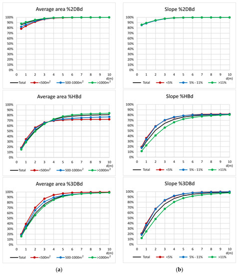 First, Figure 5a shows the results categorized by the average area of the polygons. In this case, we have divided the range of cases into three intervals: below 500, between 500 and 1000, and above 1000 square meters. The purpose of this division is to analyze cases related to urban and rural zones, considering that lower values of average area are related to rural zones with isolated buildings, while the highest values are related to urban zones with large blocks of buildings. The result of 2DBd shows lower percentages of inclusion in the first category considering distances from 0.5 to 3 m. This result contrasts with that obtained using HBd because the lowest percentages are obtained with the third category considering distances from 0.5 to 3.5 m. From this distance (3.5 m) to 10 m, the behavior changes, showing the highest values those zones included in the third category (the highest average area of polygons). Finally, the 3DBd results show lower values of inclusion in the third category. These results confirm that polygons from urban areas have better percentages of inclusion in 2D, but in contrast, these polygons show lower percentages of inclusion in 3D. As a hypothesis, we consider that this issue is related to the presence of more complexity in building structures in urban landscapes. This aspect supposes more variability in height. However, the vector dataset used in this study only includes basic structures of buildings and does not represent this complexity as in the case of the DSM. Second, Figure 5b shows the results categorized by the average slope of each zone. The purpose of this analysis is to determine the effect of terrain on the results. The mean values of slopes are calculated using a DTM of each zone. The range of values is divided into three intervals: less than 5%, from 5% to 11%, and greater than 11%. The results of 2DBd show similar tendencies, while the HBd and the 3DBd show higher percentages of inclusion in cases with lower slope values (below 11%), and while the zones with higher mean slope values have lower percentages of inclusion in 3D results (HBd and 3DBd). Therefore, slope appears to show a great influence on vertical accuracy, which confirms the results described in other studies [9,10].