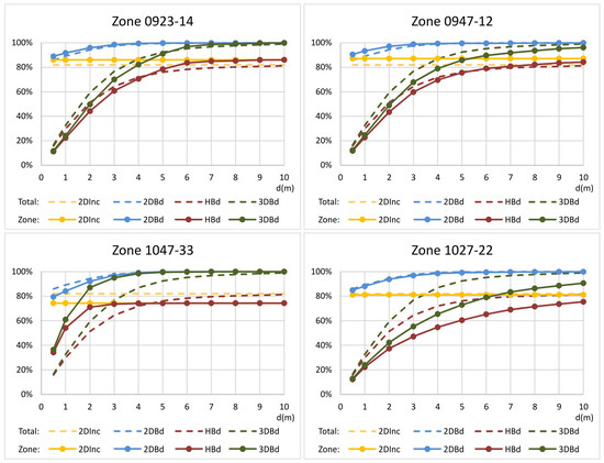 In addition to the analysis of results from the set of zones categorized by the type of scene and the terrain, we also analyzed some specific zones which are representative of the categories previously studied in order to detect particular behaviors. Figure 6 shows the results of these specific zones compared to the total results: 0923-14 and 0947-12 are urban zones including two of the main cities of Andalusia (about 5500 and 3200 polygons, respectively), while 1047-33 and 1027-22 are rural zones (about 360 and 270 polygons, respectively). On the other hand, 0923-14 and 1047-33 cover flat terrain (average slope of 3.9% and 2.5%, respectively) while 0947-12 and 1027-22 cover undulating and mountain terrain (average slope of 14.3% and 24.7%, respectively). The results of zone 0923-14 show higher values of inclusion in 2DInc and 2DBd with respect to the total results while HBd and 3DBd show lower values. Zone 0947-12 shows similar behaviors to the previous one. In contrast, zone 1047-33 shows higher values of HBd and 3DBd with respect to the total although the 2D results show lower values. Finally, 1027-22 shows percentages lower than the total in HBd and 3Dd. These results indicate the importance of the type of scene (urban or rural) and terrain in these results. Urban zones show lower values of 3D inclusion, while 2D percentages are higher than the total. On the other hand, rural zones show lower values of 2D results. Considering the type of terrain, all cases of 3D results in undulating and mountain terrain show lower values. This also occurs in zone 0923-14 (urban and flat), while the other flat zone (1047-33) show the best percentage of inclusion in these 3D results. Thus, the influence of the type of scene (urban vs. rural) is clear in 3D results. The influence of terrain slope is not clear considering these zones because it can be affected to a greater extent by the type of scene.