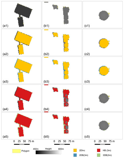 To test the behavior of these metrics in urban scenes, we selected several cases of buildings. In this sense, Figure 7 shows the results obtained for specific buildings located in an urban zone (0947-12). The three examples (Figure 7(a1,b1,c1)) represent those cells included considering the results of inclusion obtained in the 2DInc (Figure 7(a2,b2,c2)), 2DBd (Figure 7(a3,b3,c3)), HBd (Figure 7(a4,b4,c4)) and 3DBd (Figure 7(a5,b5,c5)) by taking into account a buffer distance of 3 m. The first example (case a) shows a building where a large number of cells are included in both 2D and 3D. The second example (case b) shows a building with a large amount of inclusion in 2D but with some gaps in 3D due to the height discrepancies of some internal cells. The third example (case c) shows a building with a large amount of cells included (2D results), while the 3D values of inclusion are null (HBd) and some cells are included within the 3D buffer. Clearly, this building has great discrepancies in height probably due to its complex structure that is not well defined by vector data.