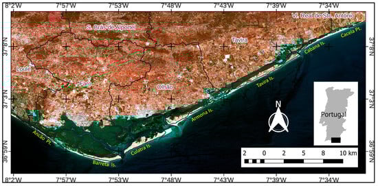 The Ria Formosa is a subtropical wetland that is in the southeastern coastal region of Portugal between the parallels of 36°55′ N and 37°10′ N and between the meridians of 8°10′ W and 07°30′ W (Figure 1). It consists of a system of sandy barrier islands that extends for 50 km, from west to east, composed of five islands called Barreta, Culatra, Armona, Tavira, and Cabanas, which are delimited by six tidal channels. At its end, it is delimited by two peninsulas called Ancão and Cacela, which connect to the mainland and are formed by extensive sandy spits [,,].