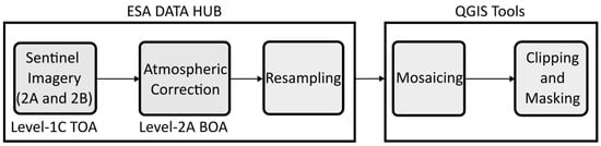 The mosaic of these scenes was obtained by the image fusion algorithm (Gdal_ merge.py) using QGis v. 3.22.16, a free software used in this work because it is an open-source project [] that integrates Gdal and GRASS algorithms. Each scene mosaic produced and resampled to a spatial resolution of 10 m was subjected to a Boolean mask (0: outside the area of interest and 1: area of interest), using the GRASS algorithm “r.mask.rast” to contextualize only data from Ria Formosa and its surroundings, eliminating distant areas from the data context as invalid data (NULL DATA) (Figure 2).