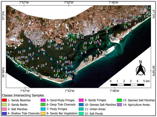 The interpreted classes corresponded in each mosaic of scenes to the typical morphologies of the Ria Formosa and were of interest for the monitoring of its environmental dynamics, as follows: 1—Sandy Beach, 2—Sand Bank, 3—Marisma (Salt Marsh), 4—Canal Shallow Tide, 5—Sandy-Muddy Fringe, 6—Deep Tide Channel, 7—Muddy Fringe, 8—Restinga Vegetation, 9—Sandy Fringes, 10—Dense Salt Marsh, 11—Urban Areas, 12—Salina (Salt Pond), 13—Sparse Marsh (Salt Marsh), and 14—Agricultural Areas (Figure 3).
