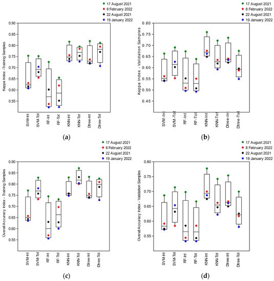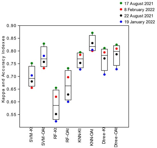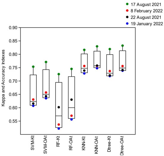 The evaluation of the training accuracy by the Global Kappa Indexes (Kt) obtained from the training confusion matrices of the SVM, Random Forest, KNN, and Decision Tree algorithms, when using the intersected segments as training samples (t), proved to be on average (͞x) more remarkable for the image of 17 August 2021 (͞x = 0.78, sd = 0.05) located in neap tide conditions (smaller tidal amplitude) in the summer season. The images from 8 February 2022 (͞x = 0.67, sd = 0.1), quadrature and winter, and 22 August 2021 (͞x = 0.67, sd = 0.07), and 19 January 2022 (͞x = 0.64, sd = 0.1) obtained under conditions of spring tide (greater tidal amplitude) in summer and winter, respectively, showed an approximate (͞x) of the Global Kappa Index (Kt) (Figure 5). The algorithms that obtained the highest Global Kappa (Kt) Indices for all images were KNN (͞x = 0.76, sd = 0.04) and Decision Tree (͞x = 0.75, sd = 0.05), and the lowest were SVM (͞x = 0.65, sd = 0.07), and Random Forest (͞x = 0.60, sd = 0.09) (Figure 5).