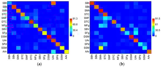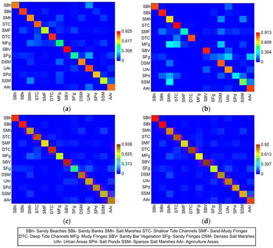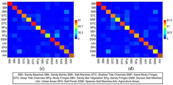 The classes obtained by SVM with weak discrimination (Recall between 0.5 and 0.7) in both training scenarios were “Sand-Muddy Fringes” and “Sparse Salt Marshes”, and with the use of the intersected samples, were “Sandy Fringes”, “Muddy Fringes”, “Sand-Muddy Fringes”, and “Agriculture Areas”. In the scenario of using samples of entire segments per image, there was only the “Salt Pond” class (Table 2). Classes without discriminative power (Recall < = 0.5) were also obtained by SVM, with the “Sandy Beaches” class due to being strongly confused with the “Urban Areas” class by training with intersected samples (Table 2 and Figure 6a). In the other scenario of using samples of entire segments of each image, the classes “Muddy Fringes” and “Sandy Fringes” had no discriminative power (Table 2).