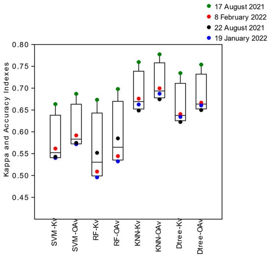 The Global Kappa Indices (Kv) obtained in the validation phase of the classification of the image of 17 August 2021 by the algorithms remained approximate, being increased for the SVM when whole or total segments were used as a training sample (+0.03), and decreased for Random Forest (−0.03), KNN (−0.04), and Decision Tree (−0.06) (Figure 11b). Also, Ref. [] reported that the Decision Tree was more sensitive to small changes in the training samples concerning the referred algorithms.