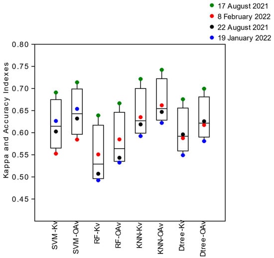 The Global Kappa Indices (Kv) obtained after validating the images classified by the algorithms (SVM, Random Forest, KNN, and Decision Tree), that had as training samples the entire polygons referring to the segmentation of each image, continued to show the highest indices for the images from 17 August 2021 (͞x = 0.68, sd = 0.05) and 8 February 2022 (͞x = 0.58, sd = 0.04), referring to the summer and winter season in quadrature conditions (lower amplitude of tide), followed by images from 22 August 2021 (͞x = 0.58, sd = 0.05) and 19 January 2022 (͞x = 0.57, sd = 0.06) obtained under spring tide conditions (greater tidal amplitude) (Figure 10). The algorithms that acquired the highest Global Kappa Indexes (Kv) after validating the image classification were KNN (͞x = 0.64, sd = 0.06), SVM (͞x = 0.62, sd = 0.06), and Decision Tree (͞x = 0.60, sd = 0.05). The lowest index was obtained by Random Forest (͞x = 0.56, sd = 0.07) (Figure 10).