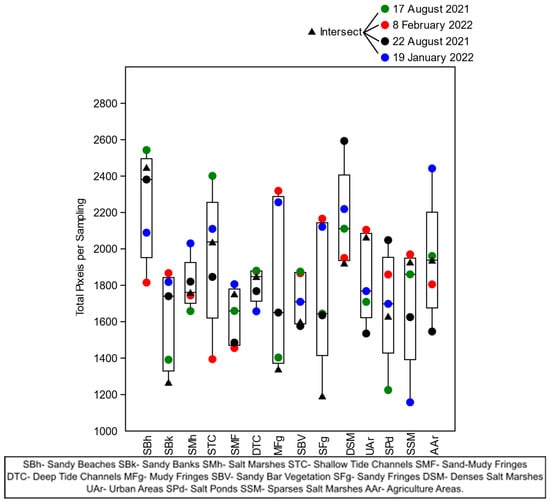 In the Winter Station, in the images from 19 January 2022 (spring tide) and 8 February 2022 (neap tide), it was possible to observe the increase in sparse swampy areas (in magenta) due to the decrease in the photosynthetic activity of the vegetation marshland, different from sandbank vegetation (light green-blue) which expanded due to the decline in anthropic activity (in red). Also, in the image from 8 February 2022 (neap tide), there was a greater formation of sand banks (in gray) parallel to the beaches due to the period of the greater incidence of waves (Figure 13).