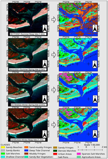 Due to the focus of this work being the implementation of ML image classification algorithms to evaluate their use in the detection of environments (classes) of intense changes, as is the case in the Ria Formosa Barrier Islands System, the input images purposely comprised different situations’ climate and hydrodynamics, referring to the winter and summer periods, and spring and neap tides. These climate and circulation conditions inferred scenarios of more extreme or diverse environmental variables (e.g., increased discharges, current speeds, migration of bars and dunes, progradation and retrogradation of the coastline and sandy strips, changes in depth channels, and flood levels of marshy areas).