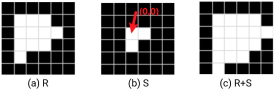 As per the above formula, the Minkowski addition of R and S is obtained as the vector sum of every point in R with that in S. The Minkowski addition is the set of all those points. Compared with the dilation operation in mathematical morphology, the method of Minkowski addition can be used for processing both raster and vector data. However, the dilation operation is defined for gray-valued images, and it cannot be used for processing vector data. The Minkowski addition method can be more clearly described using raster data as the object of study, as shown in Figure 1.