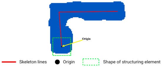In order to maintain the orthogonal characteristics of buildings, square-shaped structuring elements are chosen, with the center of a square as the origin of the representing element. As shown in Figure 3, the black point is the starting point of the skeleton line of the building, while the origin of the structuring element is located on the skeleton line throughout the morphology operation. The solid red line is the skeleton line extracted using the vector–raster data fusion method [32], and the green dashed box indicates the origin and shape of the structural element.