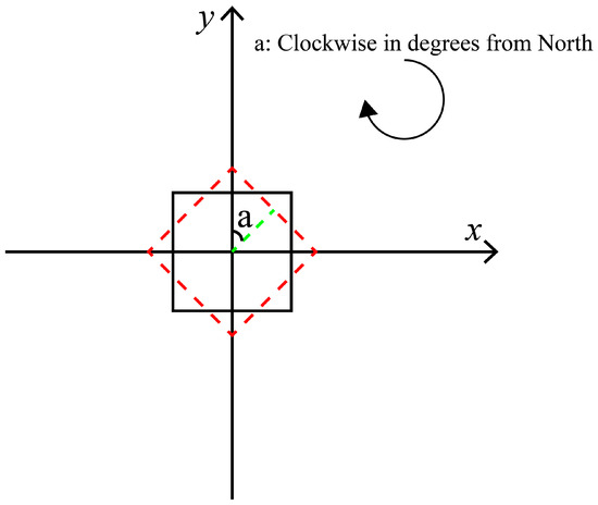 In this paper, the angle of rotation of a structuring element is defined as follows. The center of rotation is the origin of the structuring element. Here, the angle of rotation is taken as zero degrees when the orientation of the structuring element is the same as that of the Y-axis. The structuring element is rotated in a clockwise orientation until it is in the same orientation with the skeleton line. Then, the resulting angle becomes the angle of rotation of the structuring element. The angle of rotation is shown in Figure 5, where the solid black square is the state before the rotation, and the dashed red square is that after clockwise rotation in the amount of angle a.