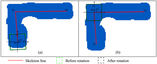 - First rotation: First, when the center of a structuring element is located at the starting point of the skeleton line, it is necessary to rotate the element clockwise by an angle of a1, as shown in Figure 6a, so that the orientation of the element coincides with the orientation of the line segment .