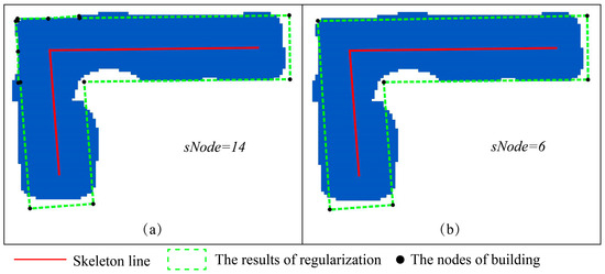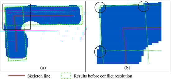 1: As the result depicts in Figure 11f, the outcome of building regularization in the top-left corner is less than satisfactory. The results of the method in this paper are strongly influenced by the quality of the skeleton line extraction. Our previous research proposed a skeleton line extraction method suitable for buildings [32], as shown in Figure 12.