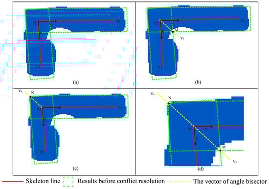 Figure 8. Conflict resolution process. (a) Unitized direction vector. (b) Vector of interior angle bisector. (c) Opposite orientation vector of angle bisector. (d) Details of conflict resolution.The unitized vector is normalized as follows: - According to the results of step 1, the unitized vector is the orientation of the interior angle bisector of and . The interior intersection M of the orientation of the unitized vector with the computed regularization result, as shown in Figure 8b.
