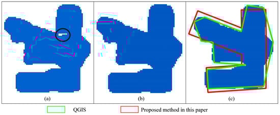 2: The interior of a building is prone to holes due to the complexity of the scene, incomplete cue extraction and poor contrast, as shown by the black circle in Figure 13a. However, the holes tend to lead to deviations in skeleton line extraction, resulting in unsatisfactory regularization results. Therefore, in order to improve the quality of regularization, the holes need to be filled in, as shown in Figure 13b. The hole filling method adopts the interface “removeInteriorRings()” from the QgsGeometry class in QGIS.