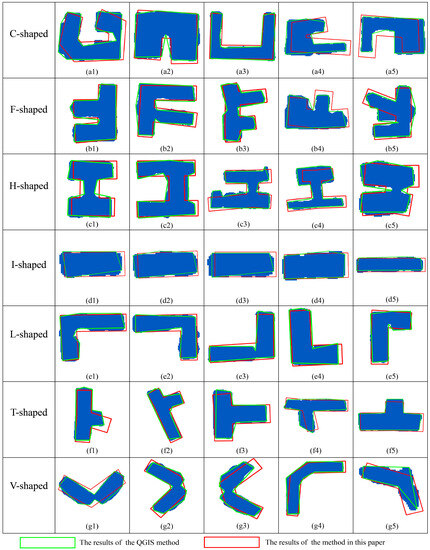 Results of QGIS software and proposed method for regularization of typically distributed buildings. (a1–a5) C-shaped, (b1–b5) F-shaped, (c1–c5) H-shaped, (d1–d5) I-shaped, (e1–e5) L-shaped, (f1–f5) T-shaped, (g1–g5) V-shaped.