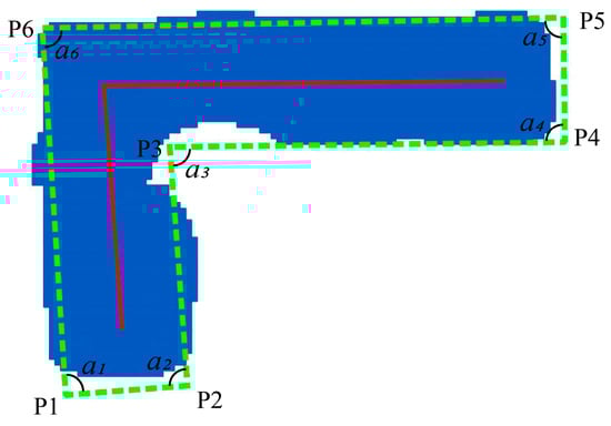 Because of the complex shape of a building, its skeleton line consists of several line segments. For each building, all the structuring elements at each node of the skeleton line need to be rotated clockwise from zero degrees to the same orientation as the skeleton line. Consider a commonly distributed L-shaped building, as shown in Figure 6 as an example, where the skeleton line of the building consists of two lines, and . In the programming of this study, the order of storing the data of the nodes in the skeleton line is , where point is the starting point of the skeleton line and point is its ending point.