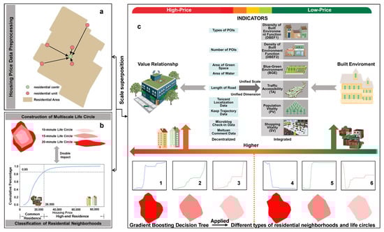 Research framework and technical route of this paper. (a) calculate the average price of residential units and display it in the residential center. (b) construct multiscale life circle and classify residential neighborhoods. (c) establishes the composition of the built environment indicators and the nonlinear relationship driven by GBDT. In which, figures 1–3 are conceptual diagrams depicting the nonlinear relationship between built environment indicators and housing prices for high-end residences under different scale of life circle, while figures 4–6 represent common residences. The same color lines represent the same scale of life circle.)