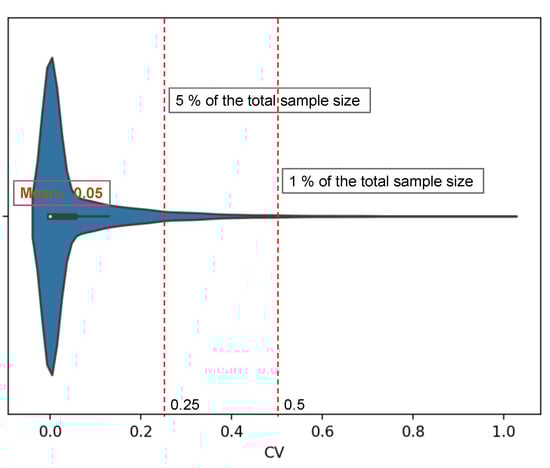 The housing price data were sourced from Beike (https://cd.ke.com/ (accessed on 18 November 2022)), China’s largest second-hand housing trading platform, using Python to call the API. Data entries without price attributes were removed, leaving a total of 8083 housing price data entries. Since the transaction prices are recorded on a per-property basis, there are cases where a residential neighborhood has multiple units, but they all belong to the same neighborhood, i.e., the built environment of the living space should be consistent. However, due to differences in construction time, layout, and other factors, price variations can arise. To eliminate this impact, the prices of these residential units were averaged and assigned to the geometric center point of the neighborhoods as the final price (Figure 1a). After processing, there were a total of 5290 residential communities with price attributes (Figure 2). Figure 3 encapsulates the coefficient of variation (CV) of housing prices during the process of data amalgamation for these residential complexes. The mean CV registers at 0.05, with”mere’y 1% of the samples manifesting a CV exceeding 0.5 and 5% of the samples exhibiting a CV surpassing 0.25. This collective profile serves to ensure a notable degree of stability in the property prices across various residential communities, thereby efficaciously mitigating the potential impact stemming from inherent idiosyncrasies of individual developments on pricing dynamics.