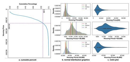The spillover effect brought about by a prosperous real estate market is crucial to the differentiation of residential spaces [57]. On the one hand, real estate market behavior is strongly influenced by the decision preferences of developers [58], especially the location choices of the built environment [59]. On the other hand, the regulation of housing prices is not entirely controlled by the supply volume of developers but depends on the demand volume of users [60]. Under the dual drive of the market and demand, the housing preferences of different social strata show differentiation, thereby exacerbating the spillover of housing prices [61]. Existing research has decomposed the housing market level from the perspective of data quantile grading [62]. This study comprehensively considers the actual housing market in the Chengdu metropolitan area and finds that when the ratio of houses for sale is close to 85%, the number of houses tends to saturate with increasing housing prices. At this time, the price is approximately RMD 26,000 (Figure 4). Therefore, the dataset is divided into common residences (≤26,000) and high-end residences (>26,000) based on this threshold. Before binning, the overall variance was approximately 7160; after binning, the variance within common residences was approximately 4717, while that within high-end residences was approximately 9015. Additionally, the variance between groups was approximately 5126. Therefore, the binning results preserve the price characteristics of common residences while blurring the uncertainty of the high-end residence group.