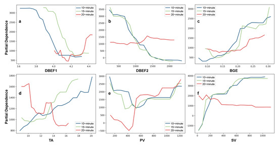 The nonlinear relationship between the built environment and the price of different grades of housing in the 15 min life circle. (a) DBEF1. (b) DBEF2. (c) BGE. (d) TA. (e) SV. (f) PV.