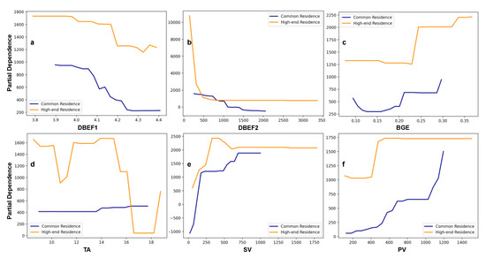 Within the 15 min life circle, the differences in the dependence of different types of housing prices on built environment indicators are further highlighted (Figure 7). The impact of DBEF2 on high-end residences is significantly stronger than its impact on common residences, while the impact of DBEF1 on both types of housing prices is similar; the BGE exhibits a nonlinear strengthening trend on the prices of common and high-end residences, while the dependence of high-end residences on BGE is significantly stronger than that of common residences. The impact of TA on high-end residences showcases an overall downward trend, while its impact on common residences is weaker and maintains a stable trend. The impacts of PV and SV on common residences and high-end residences both illustrate a nonlinear strengthening trend, among which the impact trend of SV on the two types of housing prices is relatively similar, both quickly strengthening and then maintaining a stable trend. The impact of PV on high-end residential housing prices is significantly stronger than its impact on common residences, but its impact trend is relatively stable. The impact of PV on common residences showcases a typical nonlinear strengthening trend, indicating that common residential housing prices have a strong dependence on high-density PV.