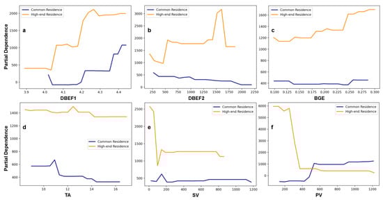 The nonlinear relationship between the built environment and the price of different grades of housing in the 20 min life circle. (a) DBEF1. (b) DBEF2. (c) BGE. (d) TA. (e) SV. (f) PV.