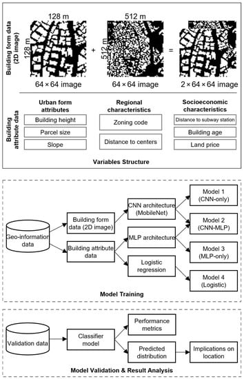 In this study, four different classifier models are compared. Model 1 is a CNN-only model. If the building outline implies some meaning regarding the urban environment, training image data with a CNN creates a fine classifier model. In addition, the classification results of this model show the pure effect of the urban form on restaurant locations. However, building outline images contain very limited information, and additional attributes should be provided to perform a more accurate classification. Model 2 is the CNN-MLP (multi-layer perceptron) model. Classifying restaurant locations using only urban form images is difficult, even for AI. Variables other than the building outline image (hereinafter referred to as “metadata”) are used to train an MLP model and improve the performance of the classifier. The MLP and CNN models are combined to obtain the best output. Model 3 is the MLP-only model. It is built to test the advantages of the CNN in the CNN-MLP model. If CNN-MLP is better than the MLP model, the CNN component of the new tool can be used to improve the existing classifier model. Model 4 is a logistic regression model. Because the three previous models are all based on machine learning, a logistic regression model is built to test the effect of adopting a neural network for the location selection problem.