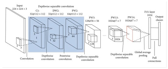 In this study, urban data in the form of digital images are analyzed. The image data are analyzed using a CNN. A CNN is a widely used method for reading and analyzing image data (including photos and videos). Since a typical image includes millions of numerical values, a CNN reads images via numerical filters (named “kernels”) and gradually reduces the image size to efficiently process and extract the features of the data [79,80]. Using CNN model, highly complex characteristics of a city can be efficiently summarized via millions of parameters in a CNN model. MobileNet, which reduces operation amounts by applying “depthwise convolution” and “pointwise convolution”, is selected to efficiently train the model [81]. The structure of MobileNet is illustrated in Figure 2. Originally, MobileNet supported images with a minimum of 128 × 128 pixels (MobileNet-128); however, the model was modified to handle 64 × 64 images [82].