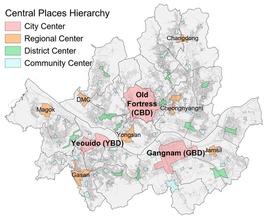 Seoul is a polycentric city that is considered to have three business centers: old fortress (CBD), Gangnam (GBD), and Yeouido (YBD). While these three business centers include most workplaces, several subcenters are distributed throughout the city, such as the Mapo or Gasan Digital Complex (Figure 3) [83]. In terms of commercial centers, Seoul’s largest commercial centers are the Myeongdong, Gangnam, and Sinchon–Hongdae areas.