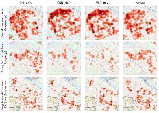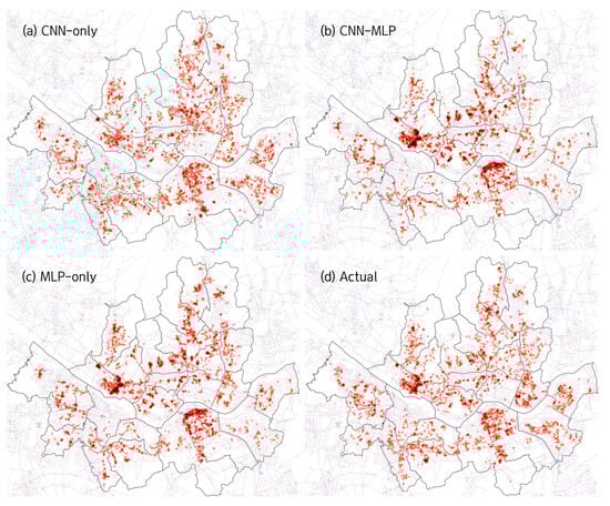 Predicted and actual distribution of restaurants. (a) Predicted distribution of restaurants by Model 1 (CNN-only model). (b) Predicted distribution of restaurants by Model 2 (CNN-MLP model). (c) Predicted distribution of restaurants by Model 3 (MLP-only model). (d) Actual distribution of restaurants in Seoul.