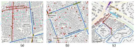 Based on the hierarchy of commercial centers, Model 1 classified fewer buildings as restaurants in the central commercial areas (i.e., Cheongdam-dong) while predicting restaurants on the backside roads (the road behind the arterial roads). In the rising commercial areas, the model predicted the new commercial area in the regional center (i.e., Seokchon Lake), but did not perform well with the buildings far away from arterial roads, whose usage was changed from housing to restaurant (widely referred to as “commercially gentrified”). As the original usage of the areas was residential and the change in urban tissue was slower than the alteration of usage, the buildings in those areas tended to be classified as residential areas [96,97]. Meanwhile, the model identified neighborhood commercial centers in the periphery (i.e., Gangseo-gu), whereas Models 2 and 3 did not predict them well. However, the model did not capture the local context without data; for example, areas where a subway station is located were regarded as equal to other areas.