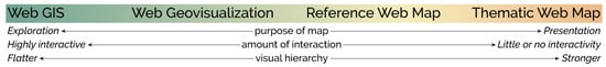 In general, the term WebGIS is accepted as a strategy for accessing and dealing with geographic information through the internet environment []. WebGIS is covered in detail in a number of publications, and it is a widely accepted term []. According to Dorman [], WebGIS is “a software and hardware configuration that enables the sharing of maps, spatial data, and geographic operations using common web communication protocols such as HTTP and WebSockets”. Meanwhile, Čepický [] defines web mapping as “the design, implementation, creation and delivery of maps using the WWW”; for WebGIS, he extends the definition to include an extra analysis and processing phase (“the design, implementation, creation, delivery, analysis and processing of maps using the WWW”). Sack [], in a chapter dedicated to web mapping, comes up with a “swoopy diagram” dedicated to the categorization of web maps. Based on a trio of defined parameters (purpose of the map, interactivity, visual hierarchy), he divides web maps into four categories: WebGIS, Web Geovisualization, Reference Web Map, Thematic Web Map (see Figure 1). In this view, WebGIS is characterized as highly interactive with a low degree of visual hierarchy and with an emphasis on exploring implications, not just as a tool for presentation purposes.