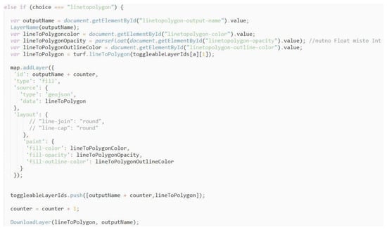 In the sidebar, under the Select operation heading, a scrolling menu was created, where all the implemented operations are located. Selecting one of them will expand a form with additional attributes and basic symbology editing options. Each operation can only be performed on a specific data type (point, line, polygon), and the suitability of each layer is ensured in the same way as for file upload—in this case, through the SuitableLayer function. In the case of the Points within polygon operation, two layers are input, and the SecondSuitableLayer function is executed with the SuitableLayer function. The result is the ListOfSuitableLayers array, which is output to the drop-down list below the selected operation. After selecting the operation, the layer and the attributes, the Execute function is launched when the SUBMIT button is clicked. It uses the getElementById() method to provide all input parameters and selects a function from the Turf.js library to execute the spatial operation (Figure 3). The resulting layer is stored in the toggleableLayersId field—and thus, in the list of layers in the sidebar—and is displayed in the map field. A link is created to download the new layer, and a cartographic feature is written on the legend.
