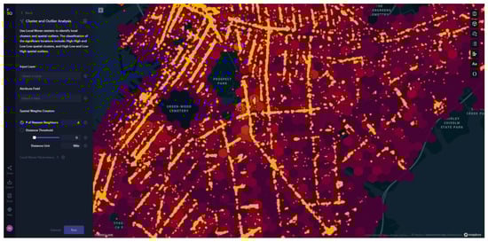 The Foursquare Studio (formerly Unfolded) [] is one of the new WebGIS tools. It supports data in CSV, JSON, GeoJSON, Esri SHP, ZIP, Excel, KML and other formats. It uses a custom HexTiles tiling system to display data, which should speed up on-the-fly data analysis and also support performance efficiency in bigdata processing. It includes two spatial operations in total: Cluster and Outlier Analysis (hot spots and cold spots; Figure 4) and Suitability Analysis (finding potentially suitable locations). There are also point, arc and grid visualization tools. The application does not yet support standalone tools; only Spatial Join can be created, or data can be filtered by spatial and temporal affiliation. Foursquare Studio can also be used in Grafana and Google Data Studio to visualize spatial data using SQL.
