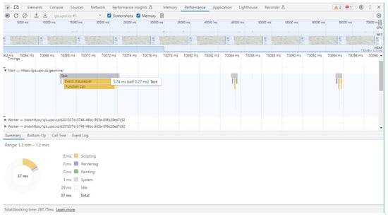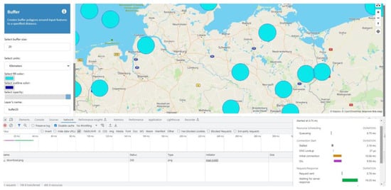 Two stages of performance tests were performed. First, the performance test of GeOnline, in two exemplary operations (create random points and buffer), was performed. The aim of this testing stage was to identify the performance limits and calibrate the performance of the GeOnline application. Then, a comparison test of five alternatives, including GeOnline, was performed to compare the performance results among alternative solutions. DevTools (Developer Console) is an integral tool in the current web browsers used to proceed, record and calculate the results of both stages (Figure 5) []. Google Chrome, the most used web browser [] with Chromium rendering engine, was used for this study to follow the same rendering as the majority of the market. Ten measurements in total were performed for each test; the minimum and maximum results were excluded; and the arithmetic mean was calculated as the final value. All performance tests were always carried out with the maximum map field zoom-out to ensure the results’ comparability. When the map field is zoomed in on a certain area, the generated layer is usually rendered earlier/faster because of the smaller data extent. All measurements were carried out under the same conditions on the same computer with the following specifications: