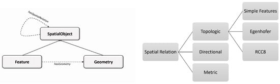 Figure 1. An abstract overview of the classes and properties defined in the GeoSPARQL standard (left sub-figure) and the types of spatial relationships where only the topological ones are implemented by the GeoSPARQL standard (right sub-figure). - is a function that assigns to each entity its type, which we denote by the function: . This function corresponds to the RDF property rdf:type. In this case, we try to simplify the model by assigning a unique type to each entity instance.
