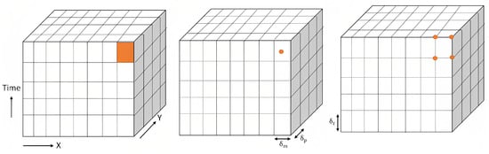 - S consists of a set of sampled spatial atoms within a given spatial coverage. Each spatial atom is bidimensionally indexed by the indices , where m and p respectively denote the number of rows and columns. This uniform sample S is maintained across all timestamps where every space–time location has one and only one value from the range of the function f: