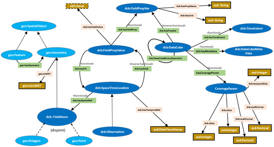 Another property that could potentially be assigned to the dcb:DataCube class is the abstract relation dcb:DataCubeBinaryRelation which could specifically represent the set of topological and arithmetic operations between each pair of two instances of the dcb:DataCube class. A dcb:DataCube class can also be associated with a class that stores all of its metadata, which may include the type of sensors used, the owner of such data, and others. The design of the whole ontology, which mentions the characteristics of data cubes and their relationships with all other classes, is illustrated in Figure 4.