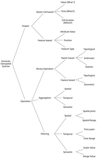 In this taxonomy, and at a high level of abstraction, we characterize any semantic geospatial query both by the nature of the operations that it involves and by the nature of the output that it might yield.