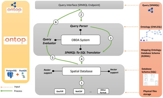 - Bereta, K.; Koubarakis, M. Ontop of geospatial databases. In Proceedings of the The Semantic Web–ISWC 2016: 15th International Semantic Web Conference, Kobe, Japan, 17–21 October 2016; Proceedings, Part I 15. Springer: Berlin/Heidelberg, Germany, 2016; pp. 37–52. [Google Scholar]