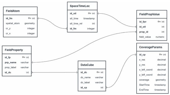 - Data integration layer. This layer lies at the bottom of the architecture and involves integrating raw data from different geospatial sources, especially raster (e.g., Geotiff and NetCdf formats) and vector (e.g., Shapefiles and GML formats) data, within a spatial database that supports both raster and vector data (e.g., PostgreSQL/PostGIS, Oracle, etc.) using well-designed database schemas. In our case, after creating our database schemas in PostgreSQL, we extracted and loaded the data from their raw formats (ex. Netcdf, GeoTiff, etc.) along with their metadata into the selected PostgreSQL relational database. Then, we used PostGIS raster functions, mainly ST_PixelAsPoint, to extract the center of each pixel related to the coverage of the data cube and ST_Value to extract the value of such pixel. The aim of this process (i.e., process 1) was to fill the schema of our database and, in particular, the three tables of FieldAtom, SpaceTimeLoc, and FieldPropValue (see Figure 7).