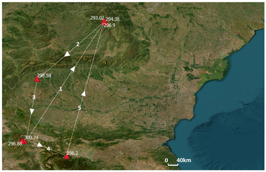 Visualization of the query result for Q8. The numbers ranging from 1 to 5 delineate the chronological order of paths followed, beginning from the initial point and concluding at the final destination while tracking the maximum temperature. The directional arrows positioned along these pathways serve to illustrate the specific direction of movement.