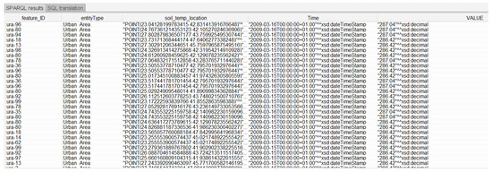 Q9 involves two nested subqueries. The first selects the maximum value of the soil temperature for each time and returns this sequence to the outer subquery to find all locations corresponding to each maximum value in this sequence. We then use a spatial filter with a topological relationship to try to find the geometric features in which these locations are contained. Finally, using the reasoning capabilities of the system, the query can infer the entity type of each geometric feature that meets the spatial criteria. Figure 12 shows the result of this query.
