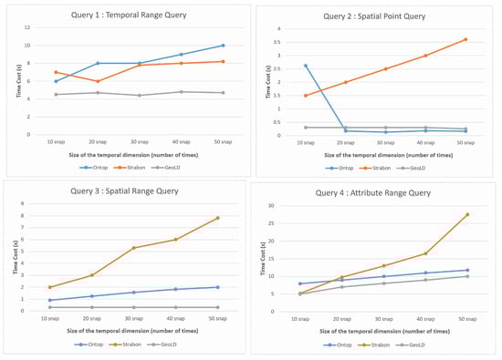 - In the first experiment, we compare our framework implemented on the basis of the Ontop system against GeoLD and Strabon. For this comparison, we use the four basic spatiotemporal queries formulated in Appendix A. We examine the runtime performance of each query and observe how the graphical curves evolve as the size of the temporal dimension (i.e., the number of time-stamped layers) increases for each system. These experiments have been conducted and are illustrated in Figure 13.