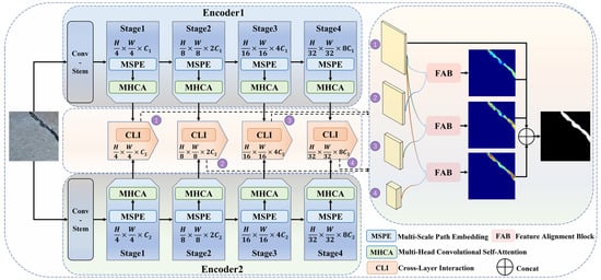 Taking these issues into account, we propose a cross-attention-guided feature alignment network specifically designed for RCD. Firstly, the Cross-Layer Interaction (CLI) module [] is utilized to effectively capture multi-scale spatial information, enrich the feature space, establish long-term dependencies between diverse channels, and refine feature extraction. This module enhances the information interaction and correlation among multi-scale features, thereby improving the accuracy of feature fusion and effectively addressing scale variations. Secondly, the obtained multi-scale features are fed into the Feature Alignment Block (FAB) [], which aids the network in better understanding the semantic information in road images. This module enhances the focus on road damage areas, reduces noise interference, improves the feature representation capability of small targets, and achieves precise RCD. Lastly, the fused features are processed through the segmentation detection module to generate the final segmentation results. In conclusion, this research makes the following key contributions: