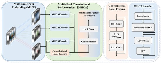 Architecture of the multi-scale path embedding and multi-head convolutional self-attention.
