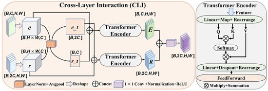 Feature Interaction. Figure 3 shows the feature-crossing structure of the CLI module. We cross-extract features obtained from the four stages of encoder1 and encoder 2 in a one-to-one correspondence, that is, and , and , and , and . Here are the specific operations involved in feature interaction: first, the input feature matrices with shapes [B, C, H, W] and [B, 2C, H, W] are reshaped separately. This transformation converts them from 4D tensors to 3D tensors, and we exchange their second and third sizes to obtain tensors and . We simultaneously perform normalization and global averaging pooling on the tensors and to obtain feature vectors of length 1, which are denoted as and . We map and to the dimensions of each other and insert a dimension of length 1 on the second dimension. We then concatenate and , and in the second dimension, and subsequently feed the concatenated feature tensors into the transformer encoder for their individual cross-attention calculation.