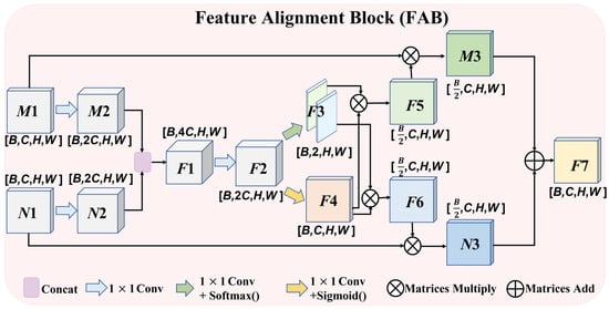 This paper shows the fusion process of feature alignment in Figure 4. In the FAB, using a convolutional layer with a 1 m wide kernel, we obtain the input feature map [, ] with channels. Subsequently, we increase the number of channels to in the feature map [, ]. Then, [, ] is spliced in the second dimension to obtain the feature map with the number of channels of . The next step is to reduce the number of channels of the feature map from to by using a convolution with convolution kernel size of 1, and the feature map is available here. In order to distinguish different spatial positions, we adopt a convolution of to conduct spatial screening of . The SoftMax function is applied to the feature map , resulting in a channel size of 2 for the obtained feature map . At the same time, with weighted different feature channels, we also utilize a convolution to screen channels and acquire the feature map with the number of channels through a sigmoid function []. The feature map is obtained by multiplying the first channel of feature map with elements in the corresponding position of feature map , and feature map indicates the probability of the first channel. The feature map is acquired by multiplying the remaining channels in feature map with elements in the corresponding positions in feature map , and the feature figure represents the probability of the first channel. Weighted fusion is performed on feature map to combine with input feature map and on feature map to combine with input feature map , resulting in the feature map [, ]. In the end, we concatenate feature maps and along the first dimension to obtain the output feature map . According to the feature alignment operation of the FAB, we input the feature maps [, ], [, ], and [, ] into the FAB, respectively, and finally obtain three new feature maps, denoted as [, , ].