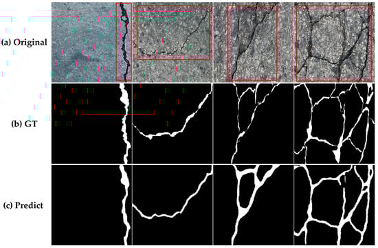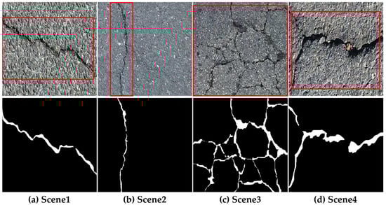 To demonstrate the superiority of CAFANet, we employ the public CRACK500 dataset [] due to the difficulty in obtaining RCD data. The dataset consists of approximately 500 images, each with a resolution of approximately . These images are obtained from the main campus of Temple University with a phone. We divide each image into 16 non-overlapping regions and save only regions with over 1000 crack pixels due to computing resource limitations. Each crack image undergoes pixel-level annotation. Therefore, the CRACK500 test data consist of 1124 crack images, 1896 crack images for the training data, and 348 crack images for the validation data. Figure 5 shows some data samples, with the first row showing the original images and the second row showing the corresponding label images. We mark the crack region in the original image with a red box.
